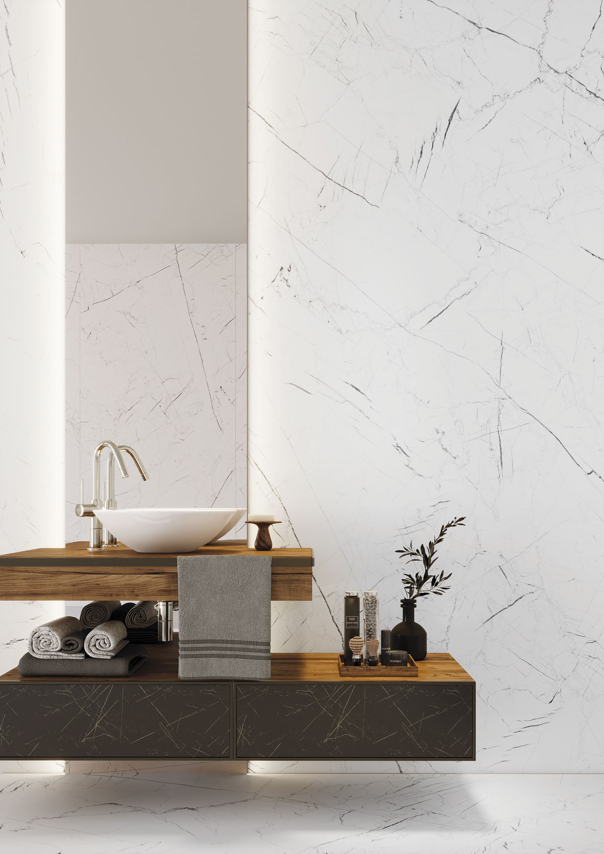 Za pun vizuelni efekat preporučuje se kombinacija sa svetlim drvetom, crnim detaljima, zlatnim ili hromiranim dodacima. Kontrast između belog mermera i tamnijih tonova doprinosi dinamici prostora i daje osećaj luksuza.